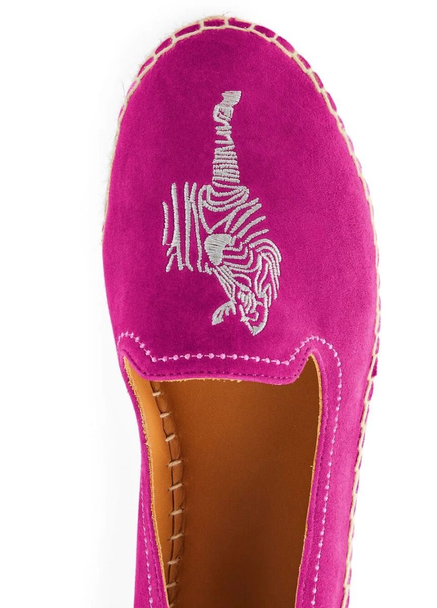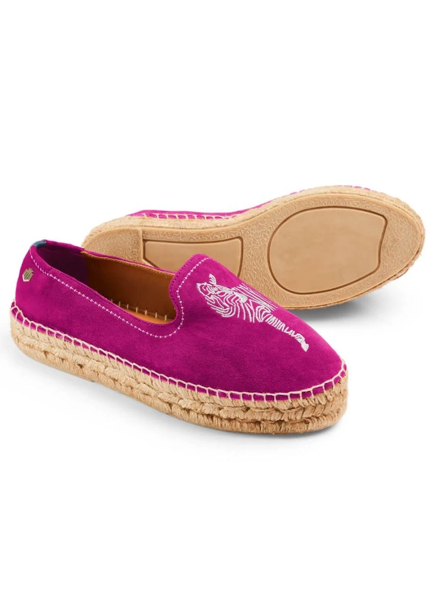 Introducing the Saint Tropez, an exciting addition to the Monaco Espadrille family. Easily distinguished by the embroidered zebra detailing, whilst retaining the classic Monaco features. This includes the contrast navy leather tab, signature gold shield and jute-covered detail on the sole. Available in tan, navy and fuchsia suede, combined with the platform sole makes them a fresh take on the original Fairfax & Favor Espadrilles. Set to elevate your summer wardrobe, they match perfectly with any outfit.