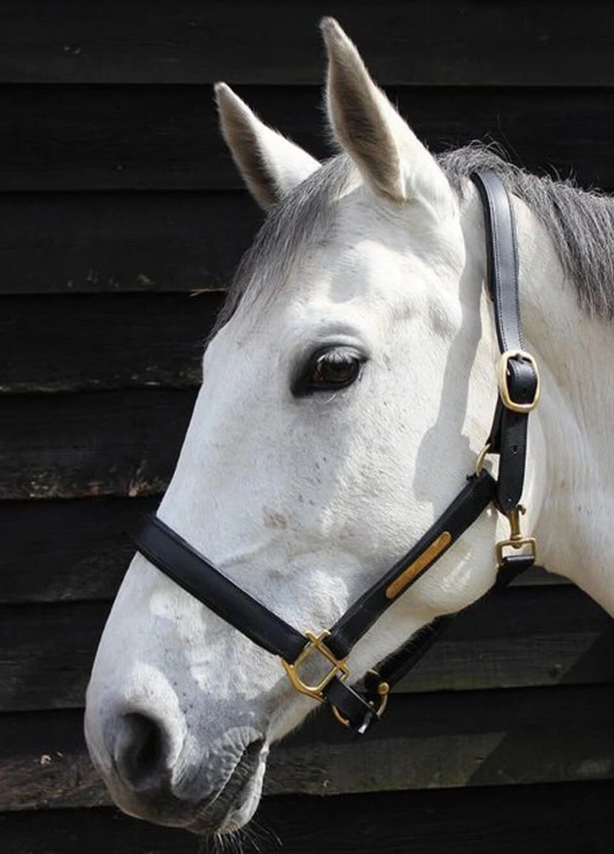 This JHL Leather Headcollar features brass buckles and name plate.