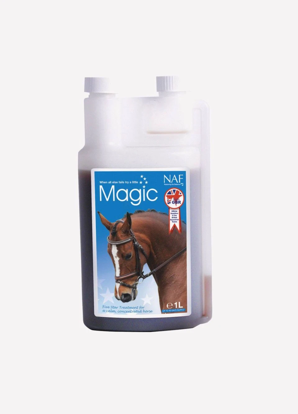 It’s often unknown that a grazing deficiency in your horses diet can cause a lack of magnesium, along with regular travelling and competing, so horses who are out less and doing more are already prone to be more excitable! This unique magnesium calmer from NAF uses completely natural ingredients to target your horses over-excitement in the most effective way possible. It has always been incredibly popular amongst our customers, as it doesn’t just encourage your horse to have a calmer outlook, it also supports his overall health and wellbeing! Magnesium is a nutrient that is well known for it’s relaxing properties, however in Liquid Magic, the magnesium is blended with natural herbs, so that the product initally relaxes muscle tension, and then gets to work incresing confidence and focus in your horse, helping him to take on his tasks much more calmly and positively! The magnesium in this supplement doesn’t go against any FEI rules, and is safe for use in all horses!