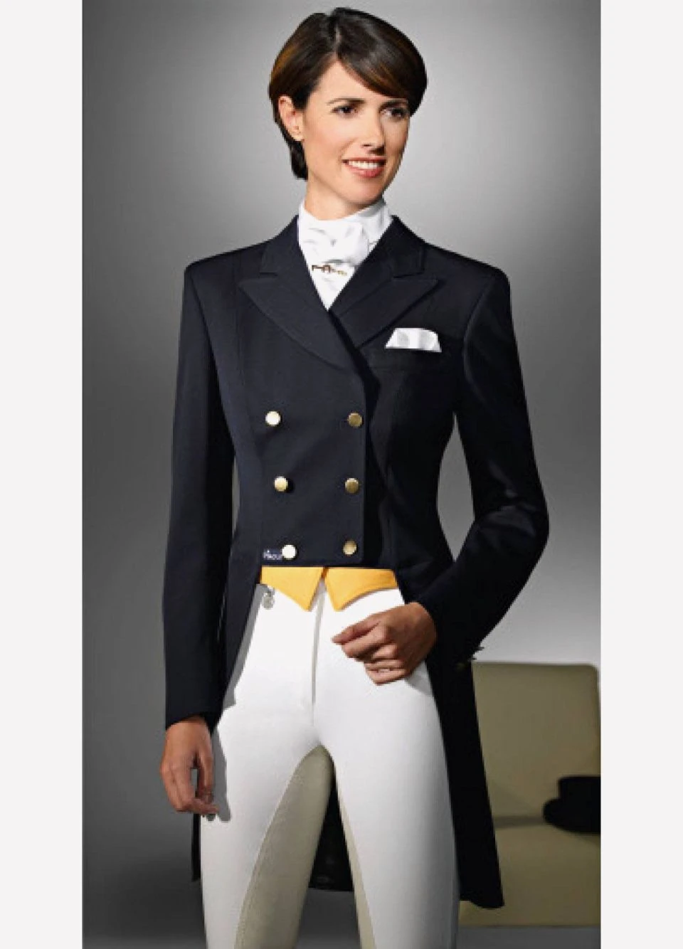 Simply wow the competition with this elegant tailcoat jacket from Pikeur. The navy colour looks oh so smart with crisp white breeches and gloves, and is perfect for adding the finishing detail to a dazzling dressage test. The tailcoat has traditional canary points, with gold buttons and weights in the tails to hold them down. It also features a lovely chest pocket, and the embroidered PIkeur logo above the front hem.Â
